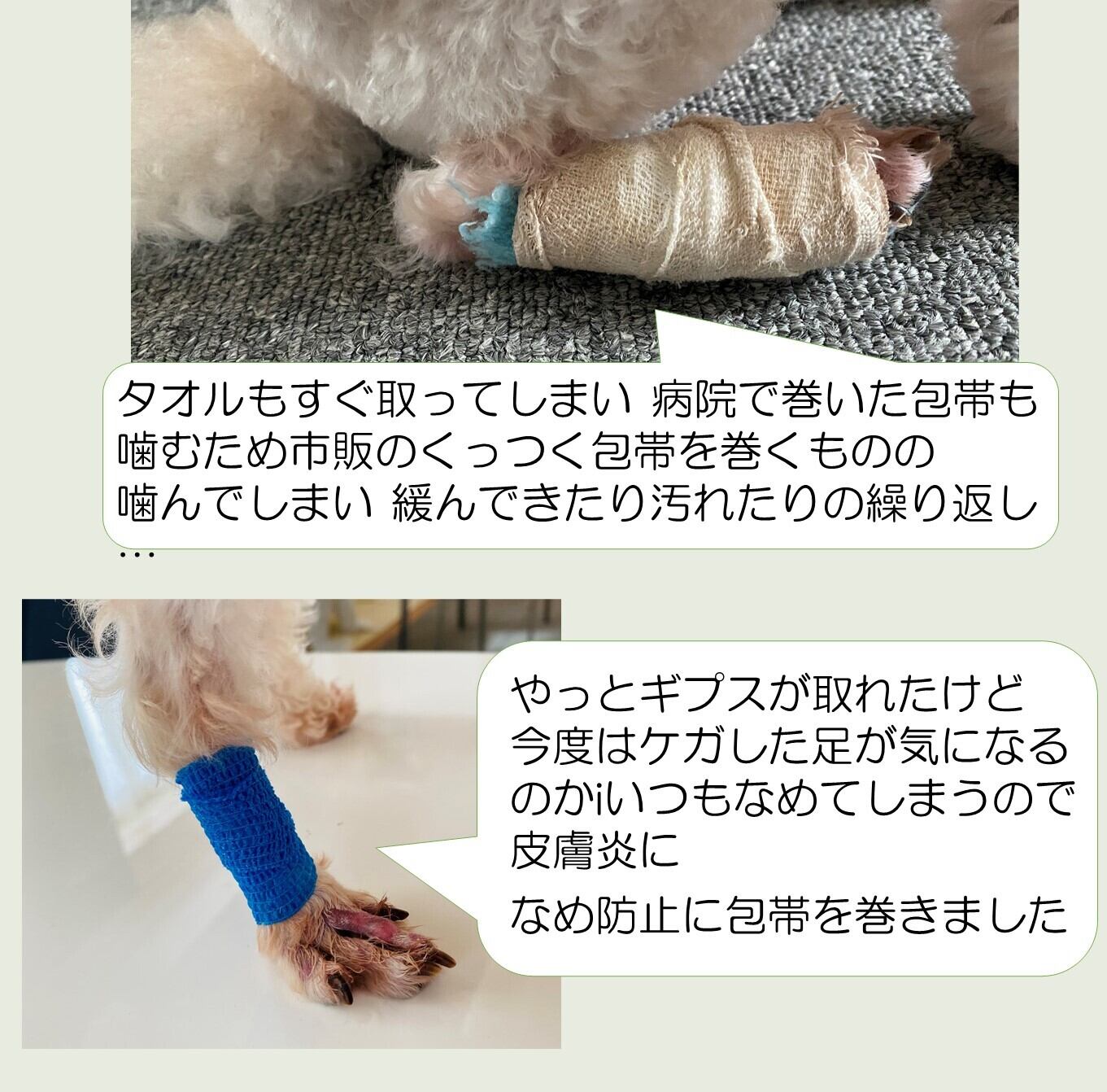 ペット介護士である店長が、販売前にケガをした当ショップモデル犬にも試しに使用してみました。 最初は気になるようで包帯をガシガシと噛んでいましたが、噛んでも破れたり剝がれたりすることがありませんでした。(※噛む頻度などにより個犬差があります)